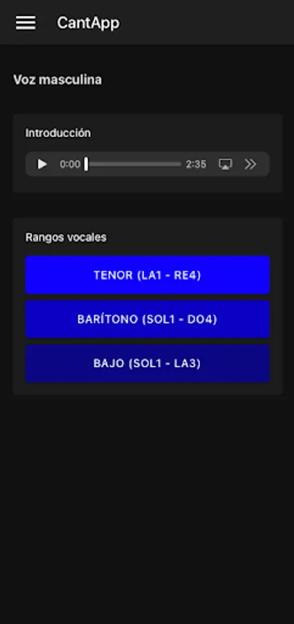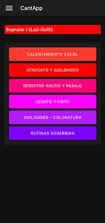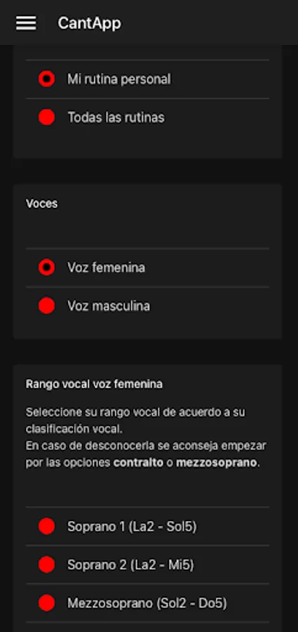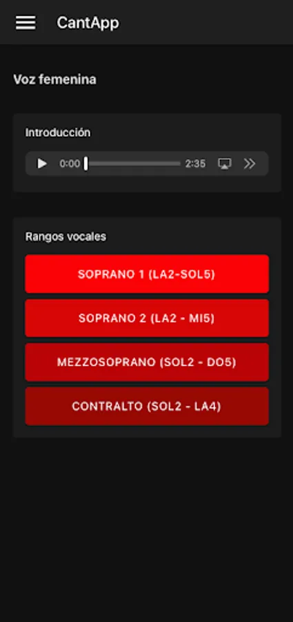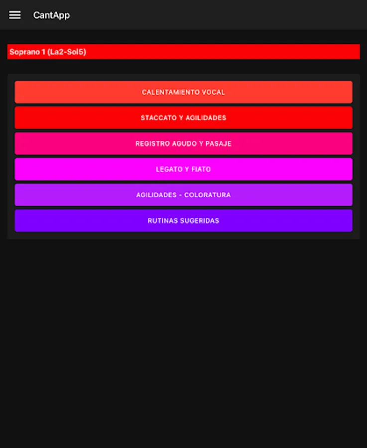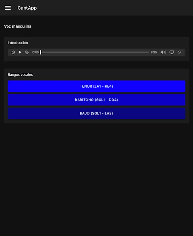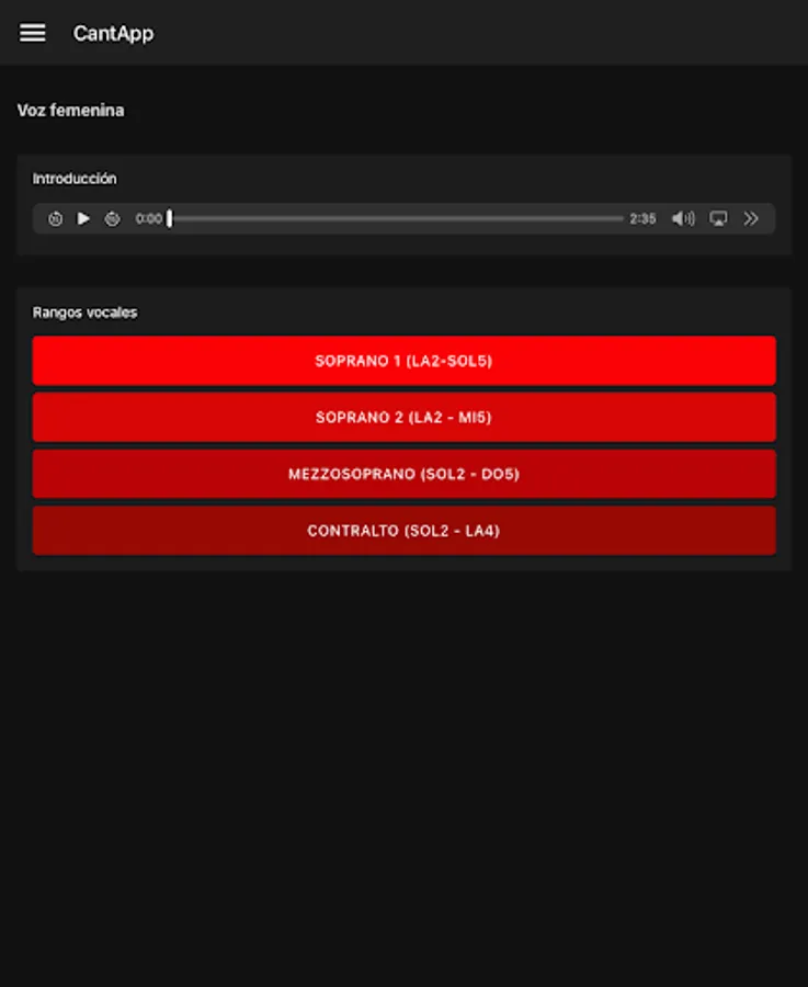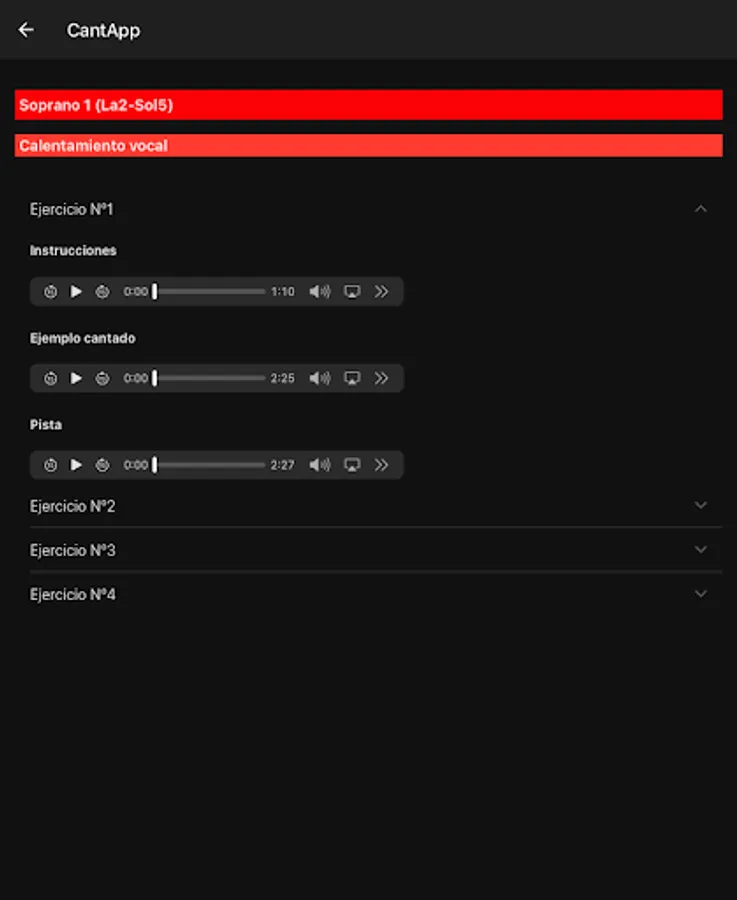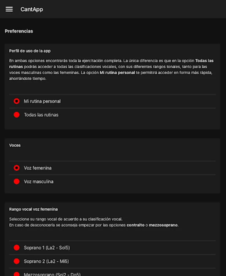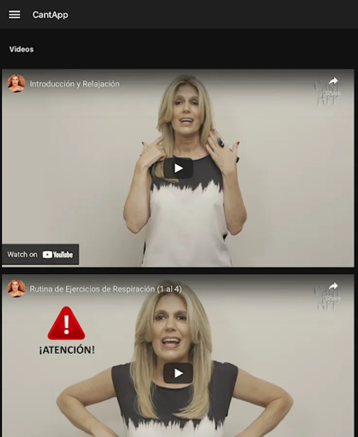 CantApp presents a comprehensive, 360° view that involves voice work in all its dimensions and addresses it from different perspectives. A new way of directing vocal training for singing at different stages of development. Suitable for those just starting out and for those already experienced. Assist the singing teacher and support self-management. It proposes complete vocal training routines with a wide range of exercises and vocalizations that will allow you to develop different singing skills. In each track, you will find the detailed explanation of the exercise, the sung exemplification, both for male and female voices, according to your vocal classification, and, at the end, a piano track to accompany you. In addition, it has a series of videos that illustrate and lead certain relaxation, breathing and semi-occluded vocal tract practices.