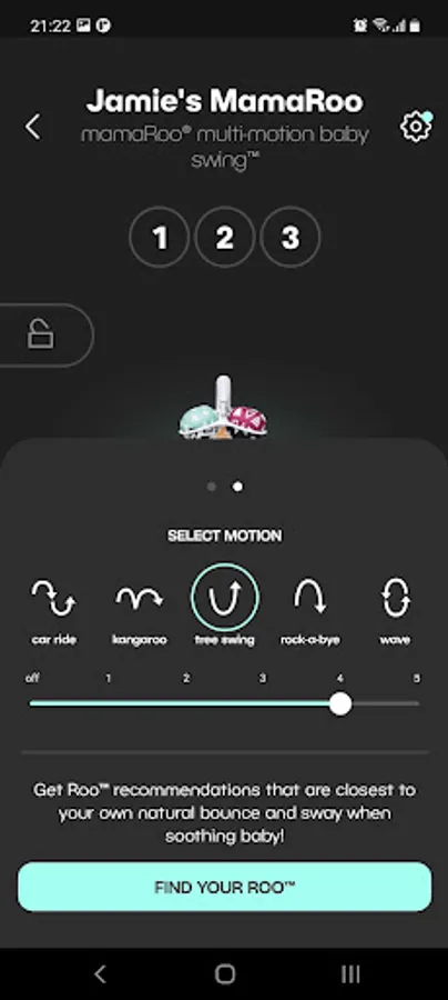 ■ NEW! “Find Your Roo” feature guides parents to find the MamaRoo® motion and speed combinations that are closest to their own natural soothing moves.