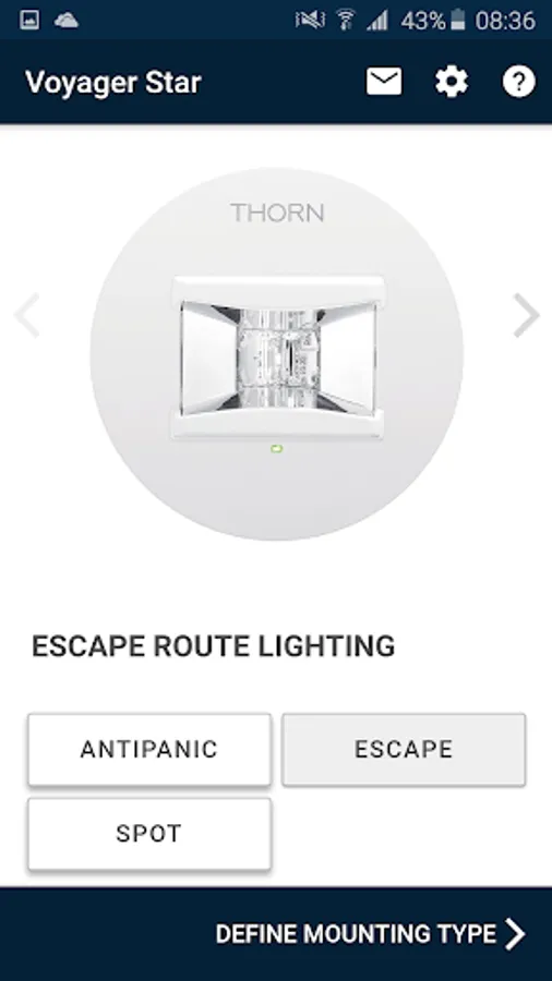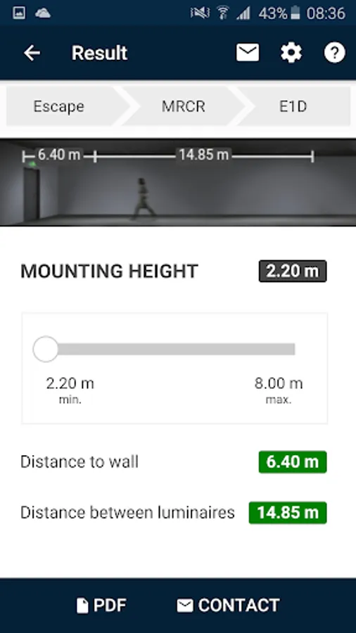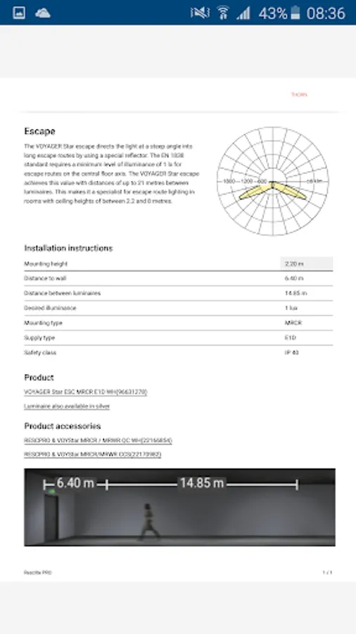 How many emergency luminaires are needed? And where do they have to be mounted? The Thorn VOYAGER Star app delivers the answers and completes the planning task within seconds: After only 3 clicks and the selection of the mounting height, the app displays the maximum distance from the wall to the luminaire and between 2 luminaires.