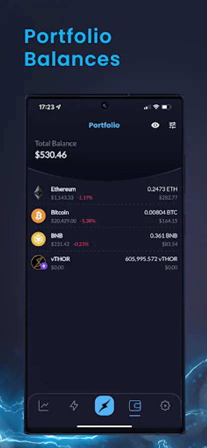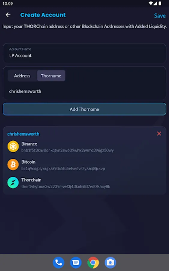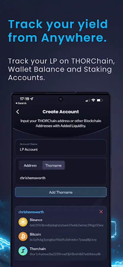 The App currently supports BTC, ETH, LTC, BCH, BNB, DOGE, ATOM and THORChain Addresses but many more chains are coming soon.