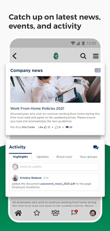 - Catch up on news and updates: Employees can stay connected no matter where they are: at the office, working from home, or travelling.