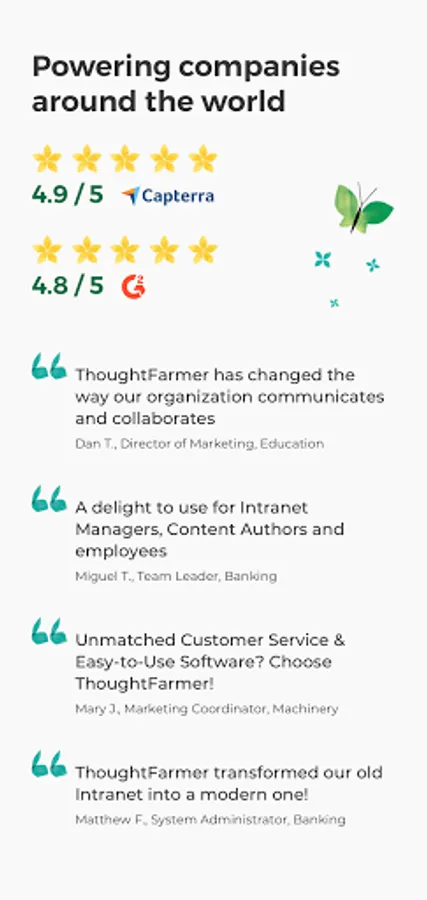 ThoughtFarmer is a leading provider of intranet software that brings people, teams, and knowledge together. Used by organizations around the world, including Hormel Foods, Petronas Canada, Guardian News & Media, and Operation Smile, ThoughtFarmer streamlines communication, facilitates knowledge sharing, and encourages collaboration across geographical distances.
