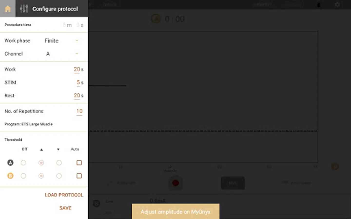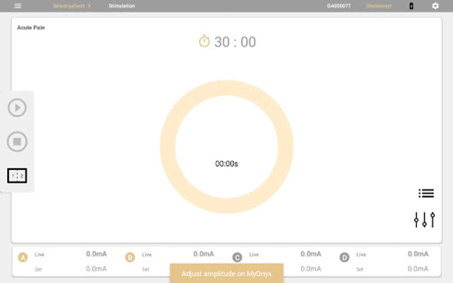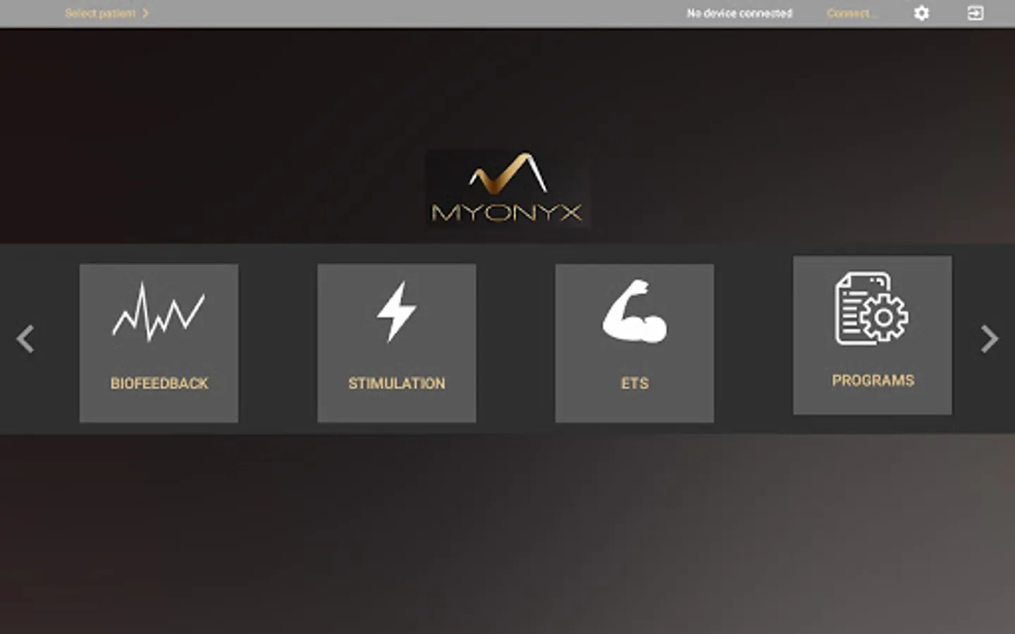The Myonyx app is an application for Android devices, intended to work with the AMI hardware as a remote controlling device. It shall allow all the features and modalities of the Myonyx device to be facilitated. These include: Electro stimulation, EMG and pressure Biofeedback, and the combination of these as ETS (EMG triggered stimulation). The app will communicate with the hardware in a two-way fashion, meaning information shall be both transmitted and received This app allows users to use four main features: