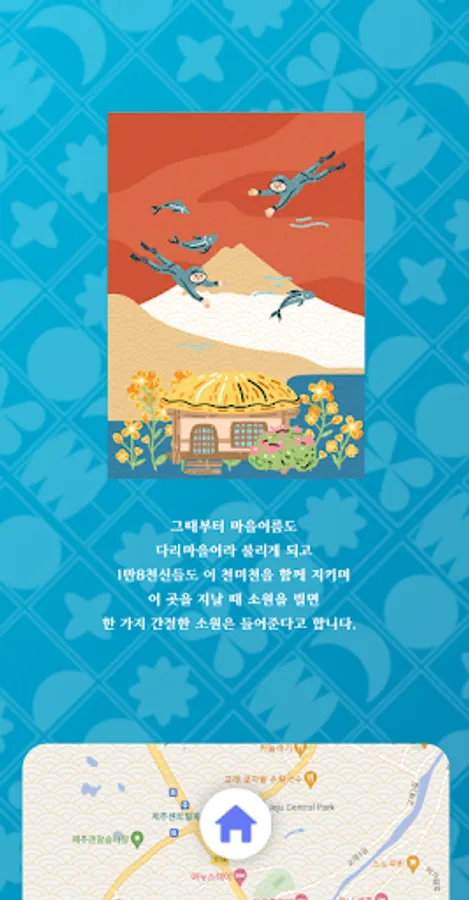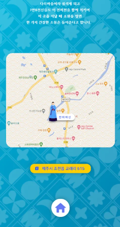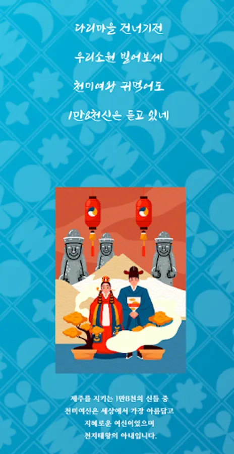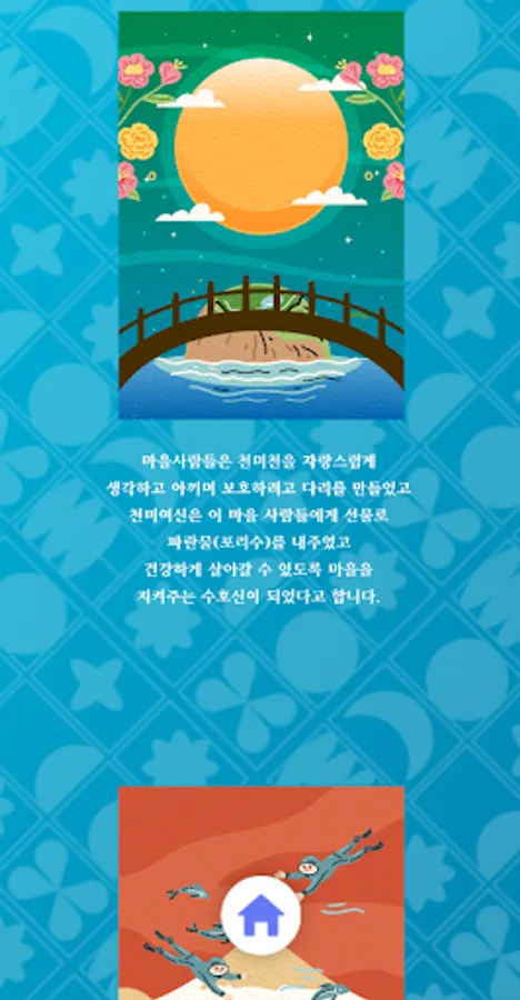 The villagers were proud of Cheonmicheon and made a bridge to cherish and protect it, and the goddess Cheonmi gave blue water (porisu) as a gift to the villagers and became a guardian deity to protect the village so that they could live a healthy life. Since then, the name of the village has also been called Bridge Village, and 18,000 gods also guard this Cheonmicheon.