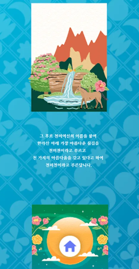 Among the 18,000 gods who protect Jeju, Goddess Cheonmi was the most beautiful and wisest goddess in the world and the wife of King Cheonji. It is said that the Cheonji Taewang mistakenly melted the body of the goddess Cheonmi in the hot lava and became the current Cheonmicheon. After that, the most beautiful waterway under Halla Mountain was named Cheonmicheon after the name of the goddess Cheonmi, and it is also called Cheonmicheon because it has a thousand kinds of beauty.
