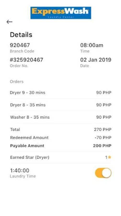 This app is for the loyalty of the customer to avail a free wash or dry of their clothes. Every machine is equivalent to 1 star. The App must be presented at participating branches to earn stars. Previous transactions may no longer be honored for earning. Purchases with a senior citizen, handicapped, VAT and discounts are eligible to earn Stars. The App must be presented at participating branches to redeem. Members should have the required number of stars before he/she can redeem the desired machine. Members can choose to instantly redeem or accumulate more stars. Stars are non-transferrable and cannot be converted to cash. Stars earned in a current transaction can only be redeemed on the next transaction.