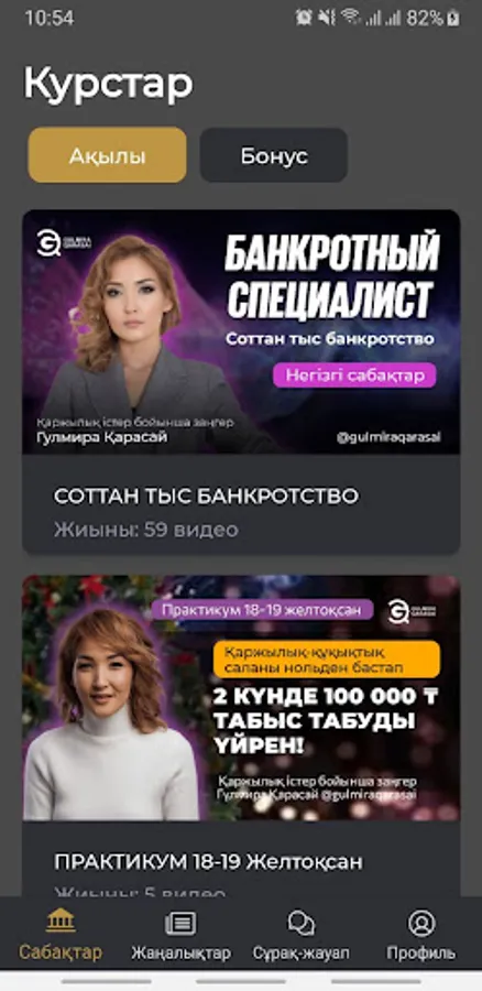 Заңның қиын және түсініксіз тілін құқық саласында 12 жылдан астам тәжірибесі бар заңгер Гүлмира Қарасайдың сабақтарын көріп, өте қарапайым түрде оңай үйренесіз. Себебі бұл сабақтардың ерекшелігі - заңды сізге қарапайым халықтың тілінде түсіндіреді. Қосымша арқылы сіз несиені заңды түрде тиімді, әрі тез жабуды, несиенің үстемақысын азайтуды, алимент өндіруді, микрозаймға артық процент төлемеудің амалын және қаржылық сауатты арттырып бүкіл қарыздан қысқа мерзімде құтылуды үйренесіз! AkshaBAR
