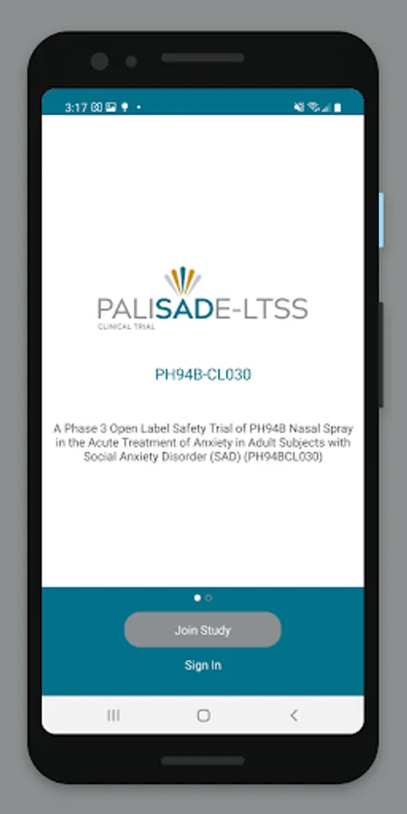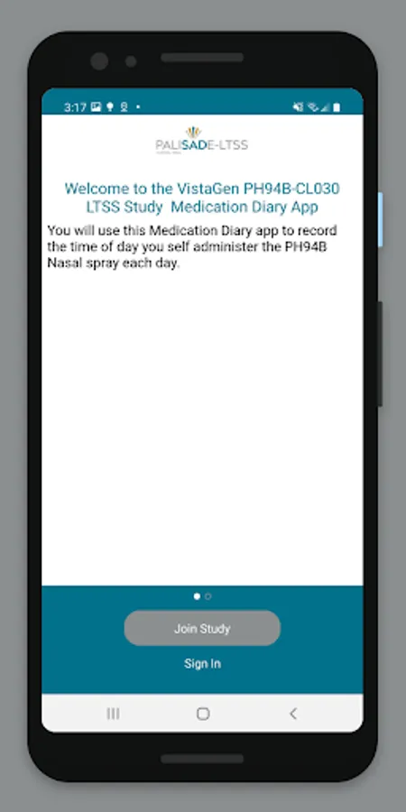The PALISADE LTS (PH94B-CL030) study app is designed to collect patient reported data from consented study participants. The app is secure and compliant with applicable regulations.