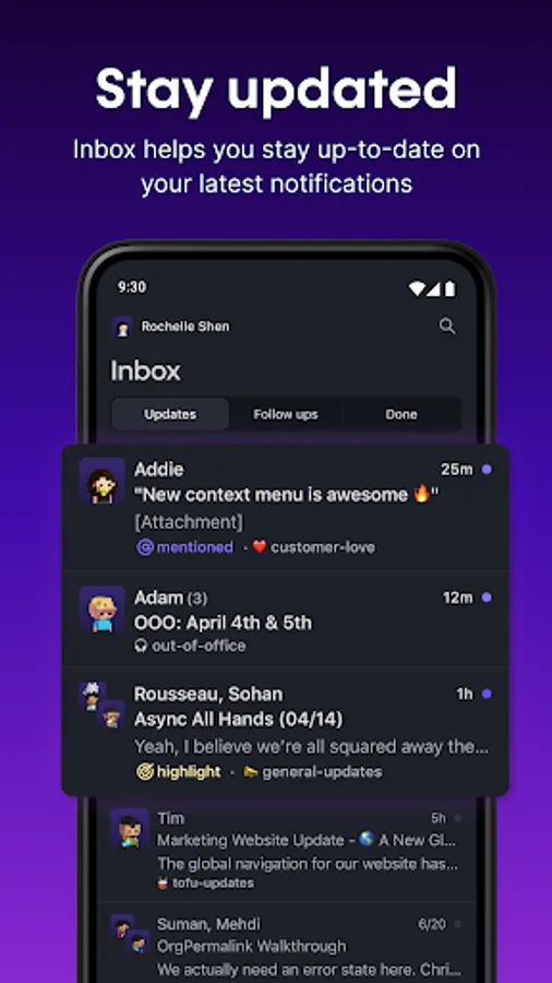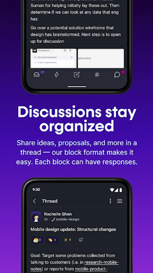 Threads are like twitter for work, which encourages punchy and easily skimmable updates & conversations, and fewer deluges of conversation that are impossible to keep up with. Breaking up longer thoughts into blocks lets your team skim, discuss, and decide on their time.