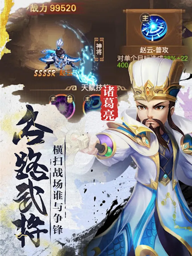 · hundreds of martial arts generals will meet your collection desire, liu bei, guan yu, zhang fei, zhaoyun, cao cao, sun quan, dong zhuo generals will wait for recruitment, and SSR generals will wait for you to command! Wei, shu and wu three forces, civil officials and military will gather, only such as the Lord to send, even if the unknown soldiers after careful training, can also be comparable to lv bu sanying! Prestige soul breakthrough limit, choose the best general, cloth battle array!