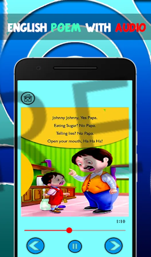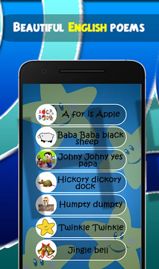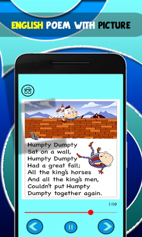English rhymes composed in elegant melodies for listening. Poems for students. The small English songs are prepared for knowledge. Audio English Poems teaches learner words pronunciation and excites them to recall. The android short English poems contains bunch of top frequently used English rhymes.
