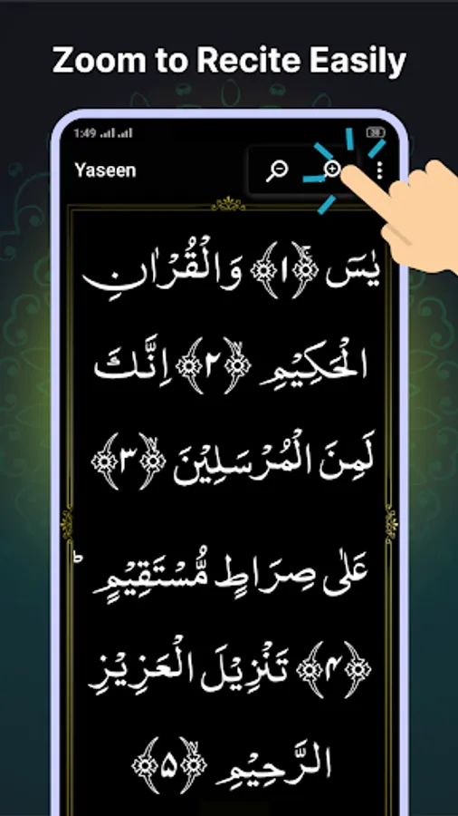 Zoom: Offline audio Surah Yasen Read and Listen to the app also provide an additional feature to adjust the text size like ZOOM-IN or ZOOM-OUT.
