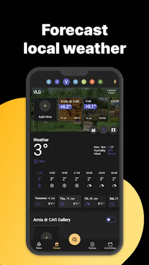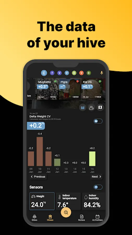 - View Notes, Graphs, Videos and photos of the hive