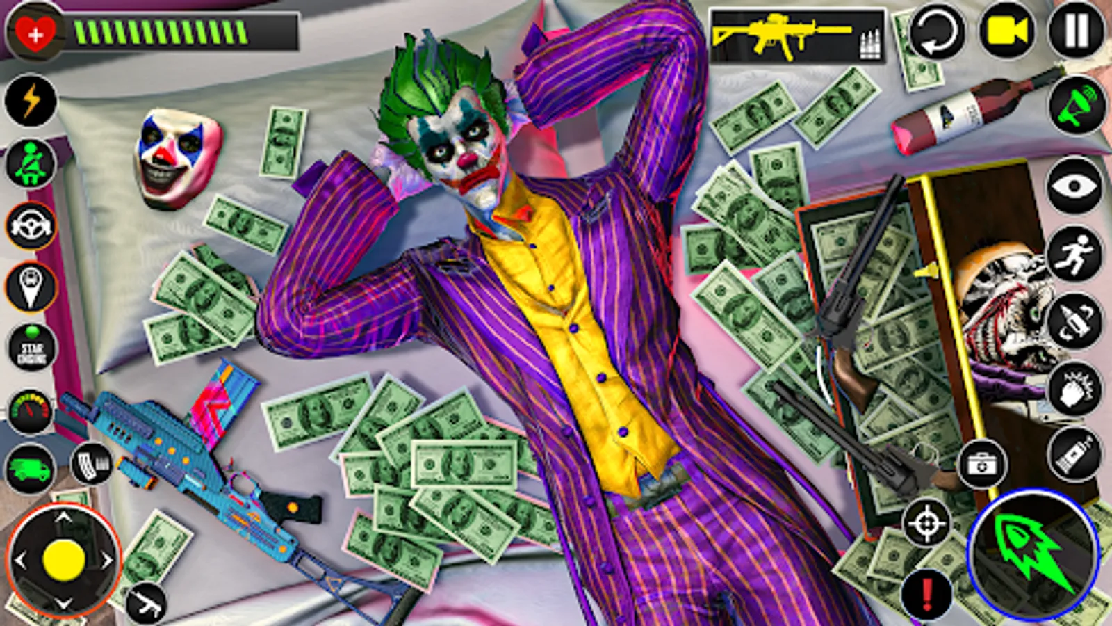 In Killer Clown Game - Bank Cash Robbery, you will take the role of a scary joker. With the scary joker game, it is your chance to explore the vegas crime super simulator city in killer clown gang robbery games and unfold unseen crime. Use your special horror clown crime simulator gang robbery skills. Take the new scary clown gang robbery mission in the super simulator city and rank up in your killer clown mafia crime simulator games. Do you like playing killer clown bank cash robbery games? engaging scary clown joker games have multiple missions like the mafia, gang robbery, and shooting games. This horror clown bank robbery game will fulfill your requirement.