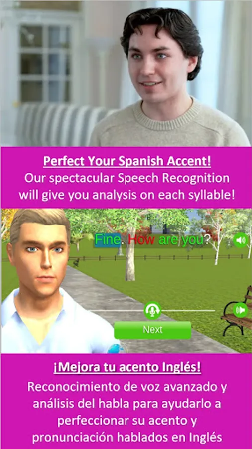 - For both English AND Spanish, FluentWorlds features Advanced Speech Recognition and speech analysis to help you perfect your spoken English and Spanish accent and pronunciation. It shows you syllable by syllable where you were successful and where you need work. NEW FEATURE…ALL OFFLINE PRONUNCIATION PRACTICE! Once the app is downloaded, you don’t have to have internet to practice!