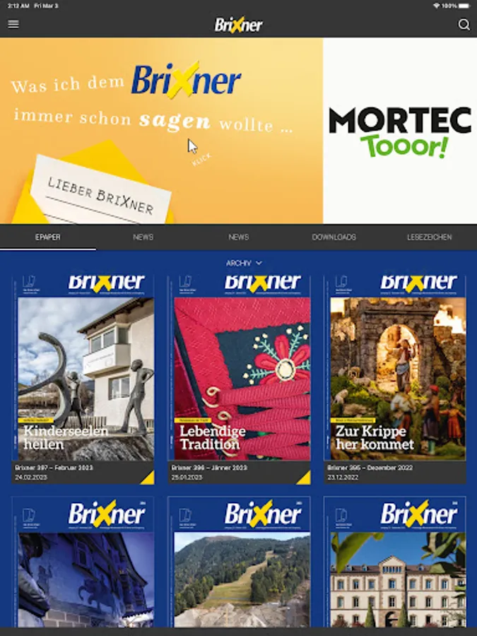 The Brixner, a German-language local magazine in South Tyrol/Alto Adige, Italy, has been published monthly since 1990 and is distributed free of charge to around 11,000 households in Brixen (Bressanone) and vicinity. Since 2010, it can also be read as an e-paper on the Internet, and beginning in 2012, the Brixner also appears as BrixnerPlus: with the Android app, the reader receives the Brixner enhanced with multimedia content.