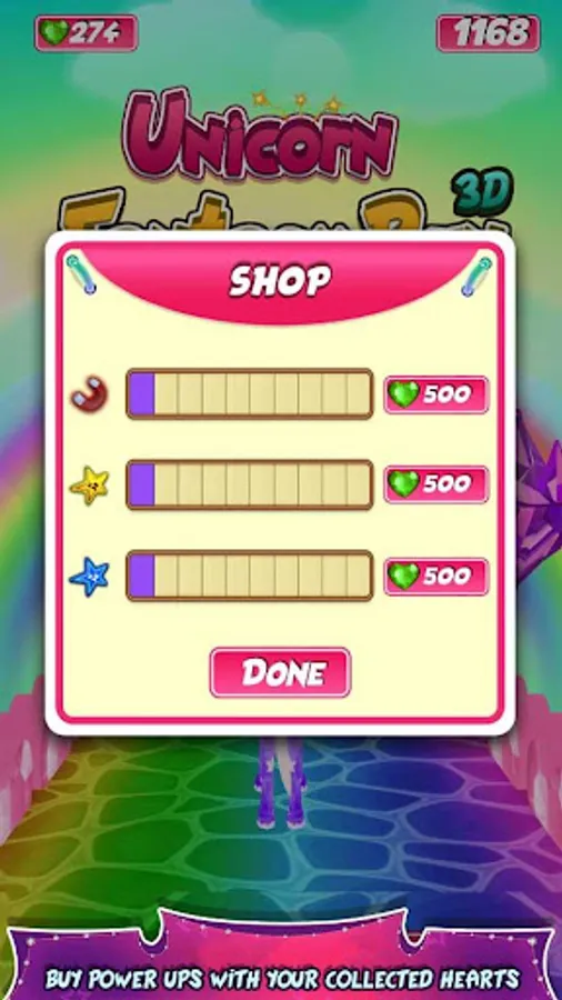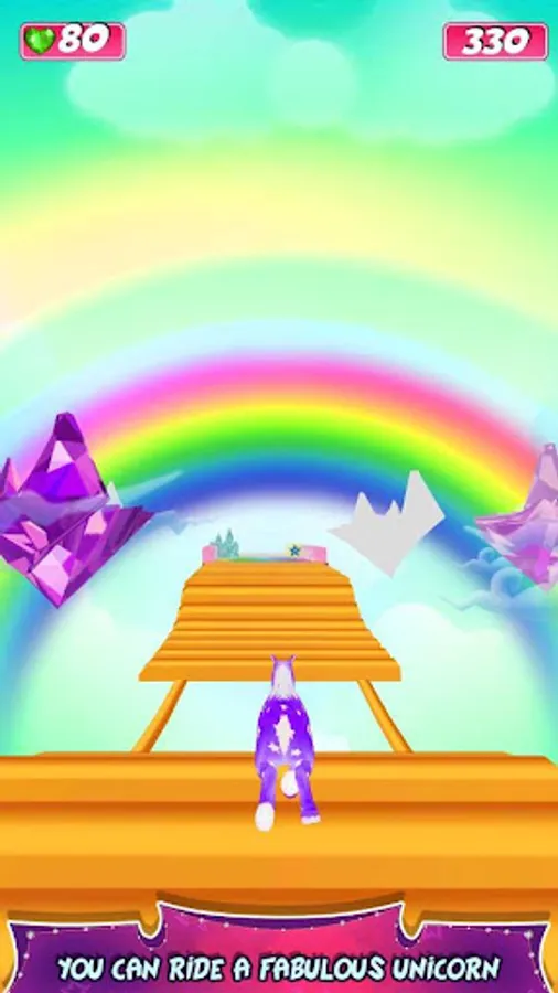 An endless unicorn run game for unicorn lovers! Start your journey in a fantasy world by running on a rainbow path.Choose your favorite unicorn and run in a fantasy magical land.Run ,jump , collect hearts and collect amazing power ups in your way.Upgrade different powers ups to double the fun.