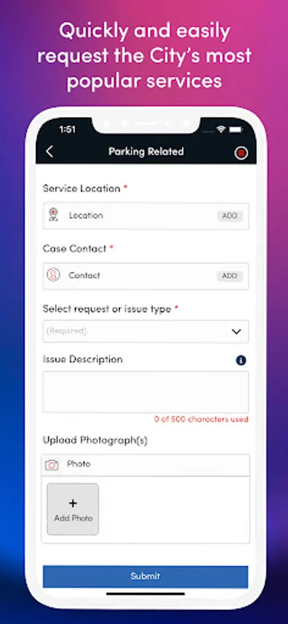 • The 'Create New Service Request’ feature allows you to quickly and easily request the City’s most popular services, including streetlight outtage, pothole repair, and bulky-item pickup .