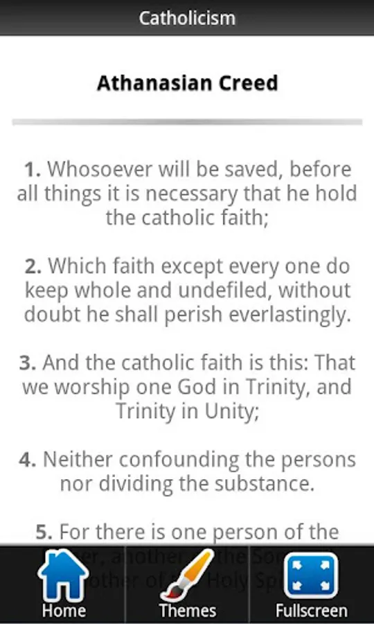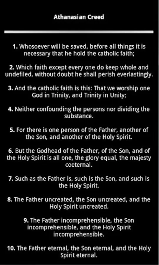 The Athanasian Creed, or Quicunque Vult, is a Christian statement of belief focused on Trinitarian doctrine and Christology. The Latin name of the creed, Quicumque vult, is taken from the opening words, "Whosoever wishes". The creed has been used by Christian churches since the sixth century. It is the first creed in which the equality of the three persons of the Trinity is explicitly stated. It differs from the Nicene-Constantinopolitan and Apostles' Creeds in the inclusion of anathemas, or condemnations of those who disagree with the creed (like the original Nicene Creed).