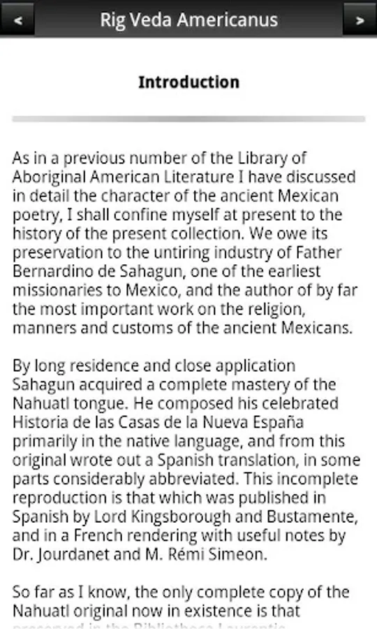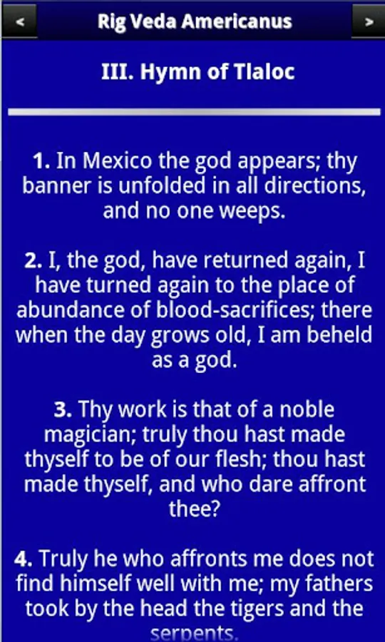 The Rig Veda Americanus (named after the sacred hymns of ancient India by the author, of which he deemed there to be a connection in the similarity of content via metaphor, although it appears no other linkages exist other that this) presents a collection of ancient Nahuatl sacred mystical chants.