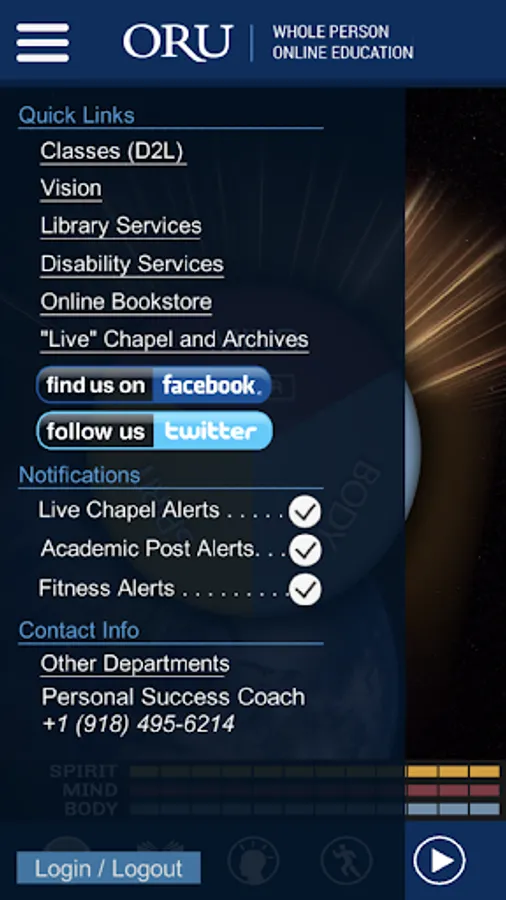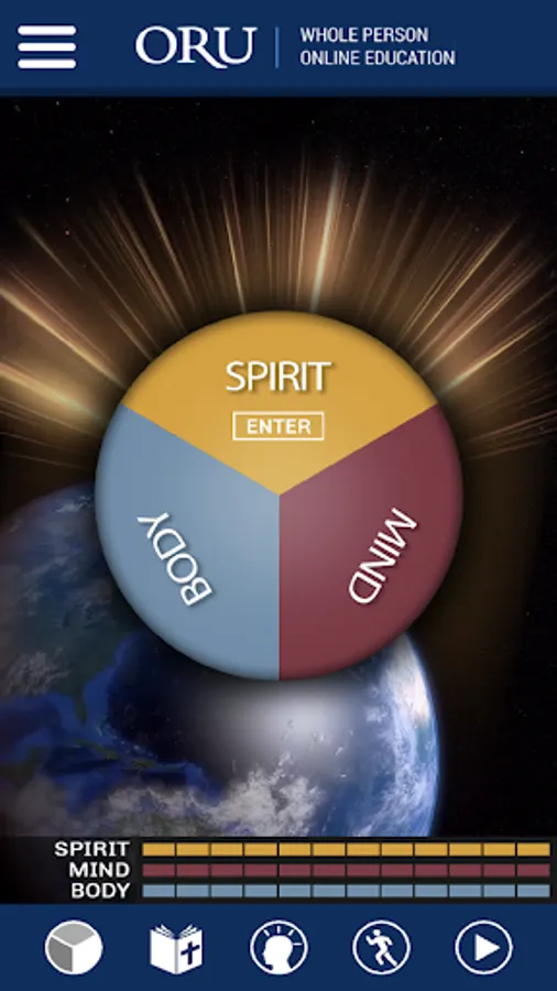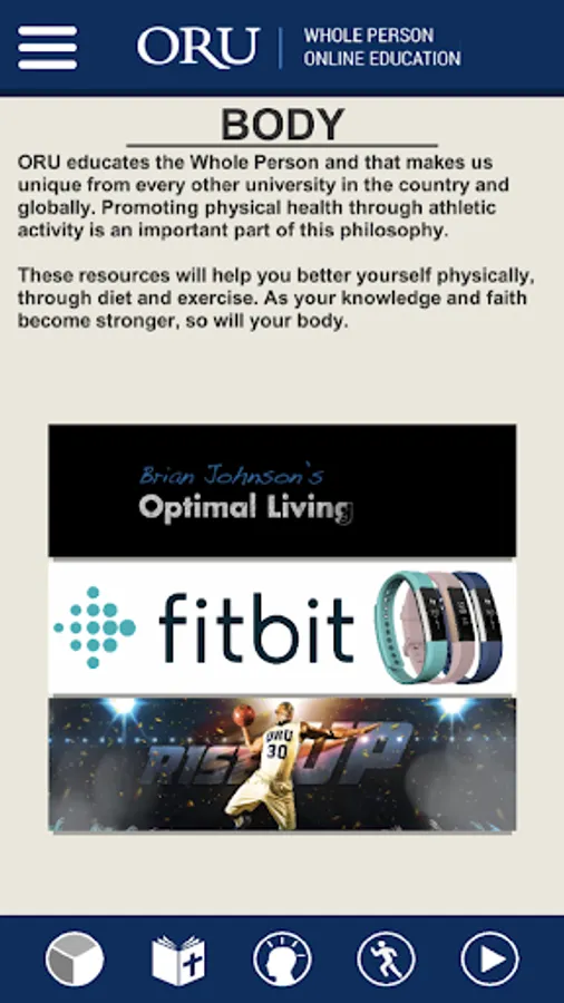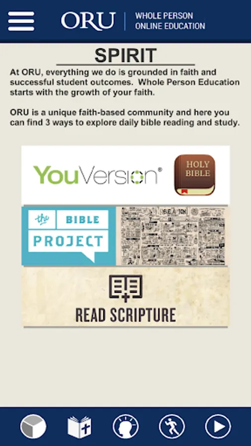 The ORU online app is an opportunity for the remote student to interact and enjoy many aspects of the on-campus-student experience. The emphasis is on the whole body learning concept of Spirit, Mind, and Body.