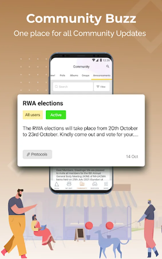 Share interesting events, stories, news, images with your apartment society neighbours. Have conversations with neighbours through the in-app chat feature without sharing numbers.