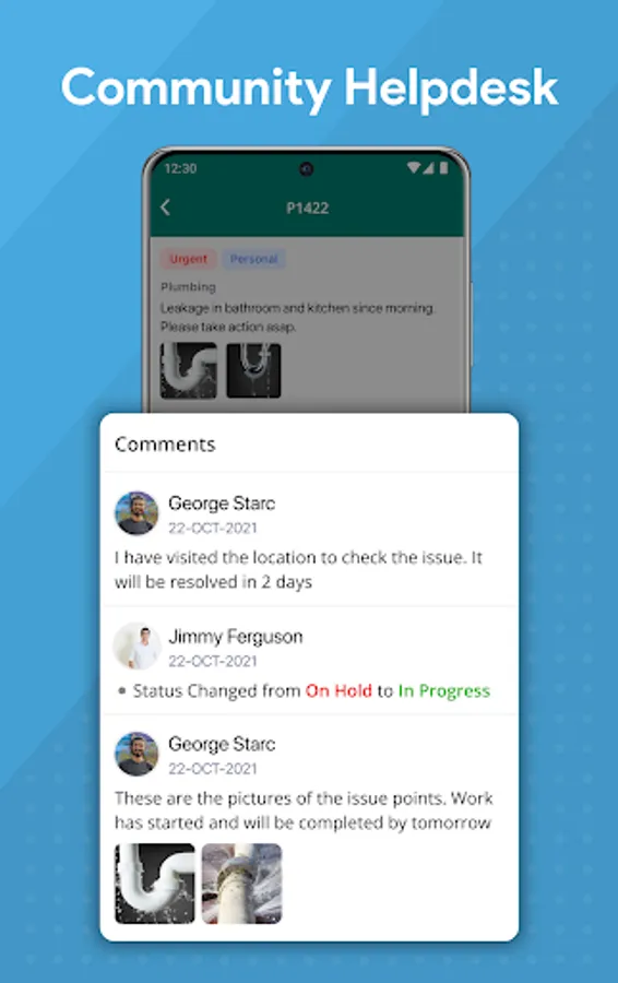 * Community Helpdesk - Ensure Customer Delight through quick action on Service Requests, Queries, Complaints. You can view all the Helpdesk requests which are raised by the residents of your Community. You can also see the status of the ticket and take action based on the status. You can provide updates which become available to residents in their App. The end to end life cycle of Requests/Complaints can be managed using this module.