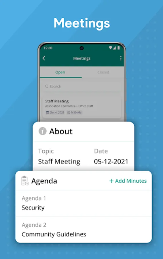 * Meetings - Take quicker, better decisions. Create meetings, take Notes, keep a history of previous meetings and more. You can create meetings from anywhere you are and send notifications to attend the meetings to the relevant Community residents or staff.