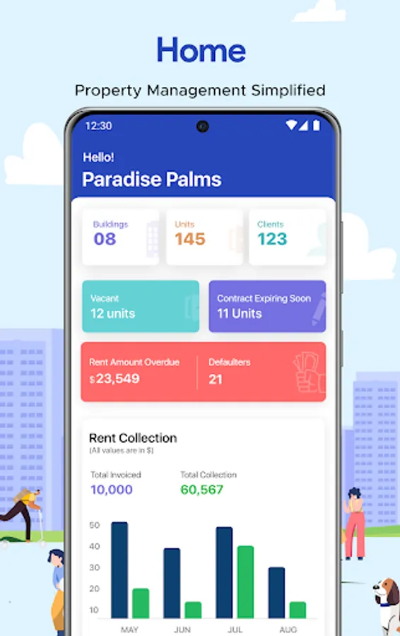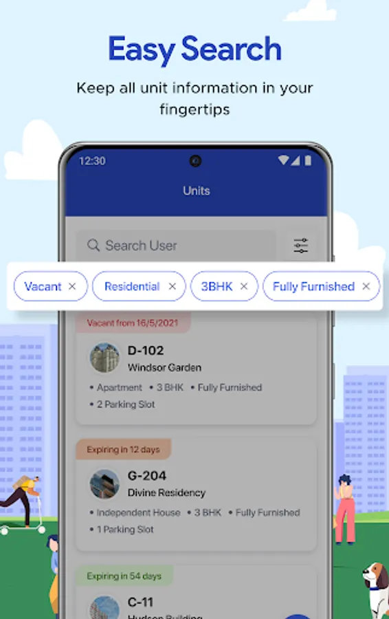 View overview of your buildings, clients, units, vacancy status, contract expiry, rental dues, defaulters and much more in a single screen.