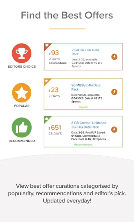 - Plans are clearly categorized : 1GB Per Day, 2GB Per Day, Editors Choice, Recommended Plans and Popular Packs. Talktime plans, Full Talktime (FTT) Vouchers, SMS packs, data packs, Special Tariff Vouchers (STV), Combo Offers, Booster packs, rate-cutters, ISD packs and so on