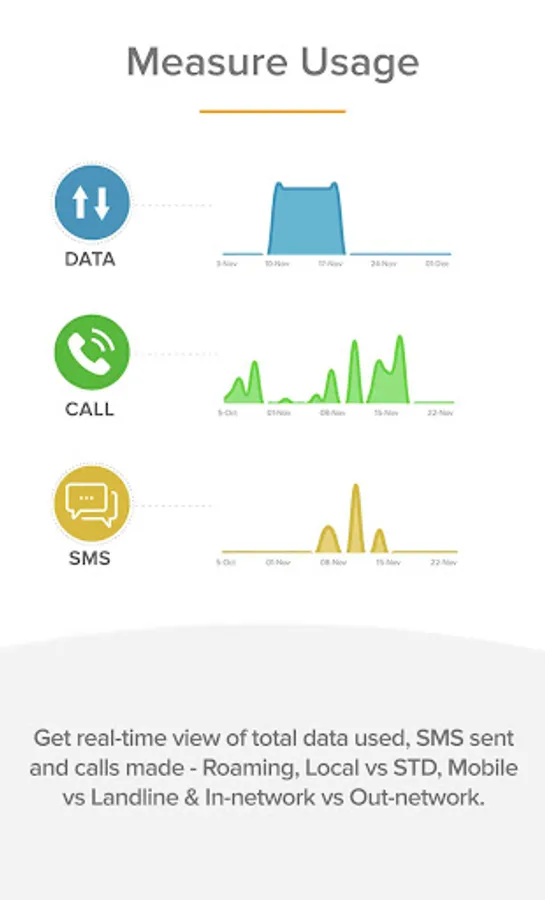 - Breaks down calls by local vs national (STD), mobile vs landline, in-network vs out-network