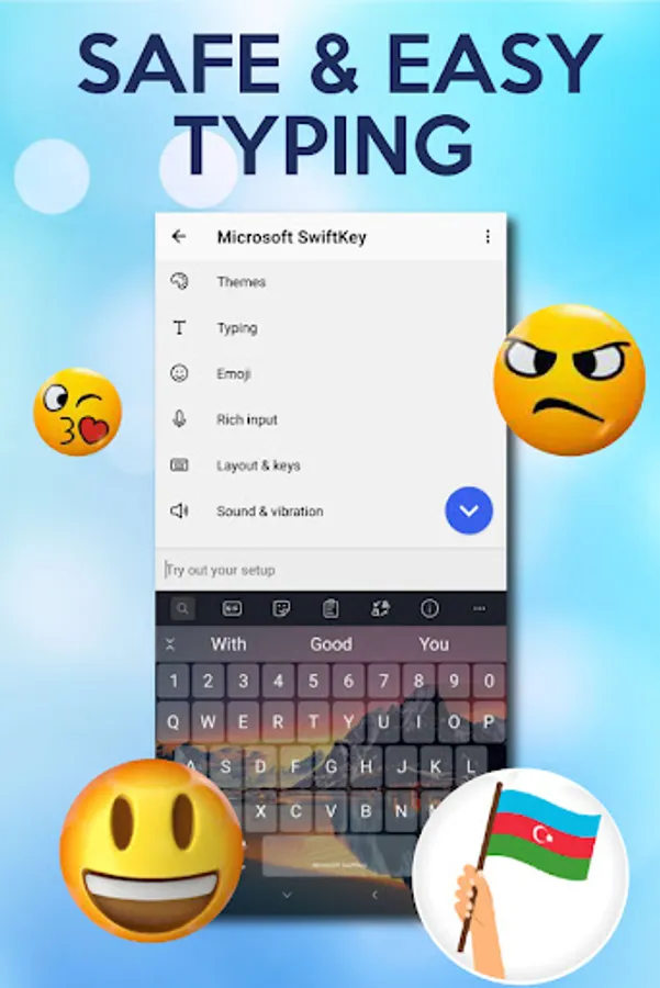 This Azerbaijani Keyboard 2021 is 100% safe because we do not save any key stroke and any kind of your personal data like photos, videos, contacts, microphone, camera etc.