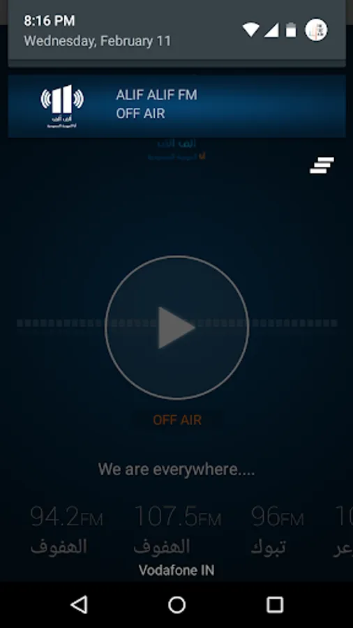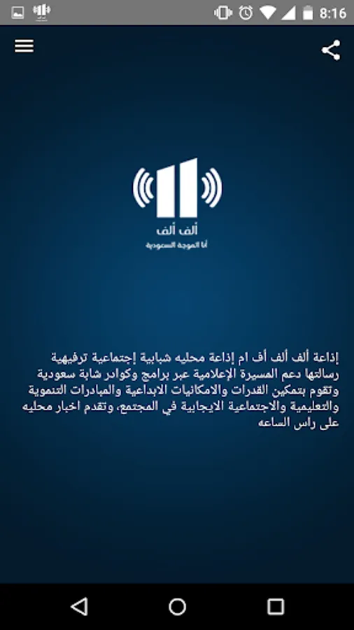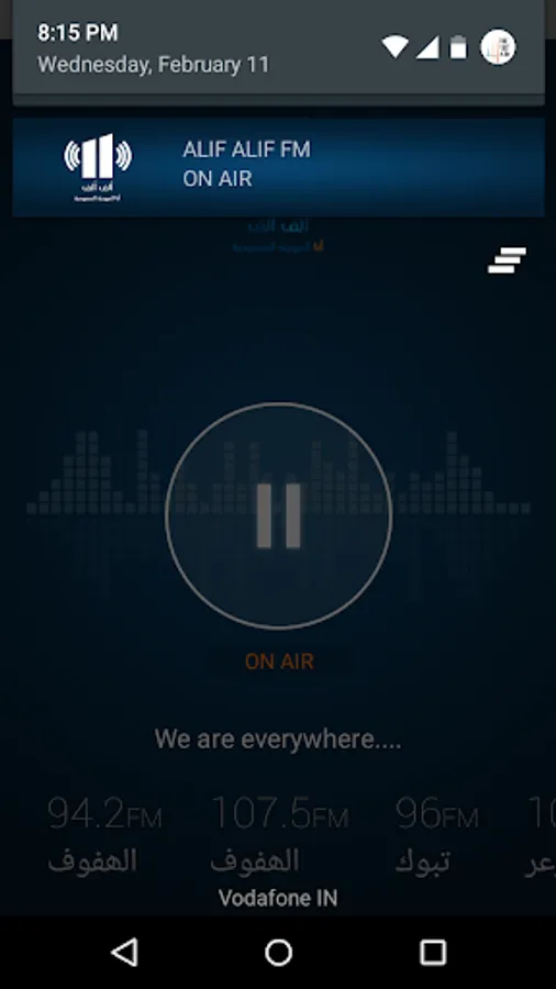 'Alif Alif FM' is a leading FM Radio Broadcasting service having it's presence all over the Kingdom of Saudi Arabia active both in FM bands as well as Internet http://www.alifaliffm.com since the last 4 years, broadcasting in 16 different FM bands. Now it proudly presents it's Android app to the audience so that you can stay tuned wherever you may go via your Android Phones and Tablets.