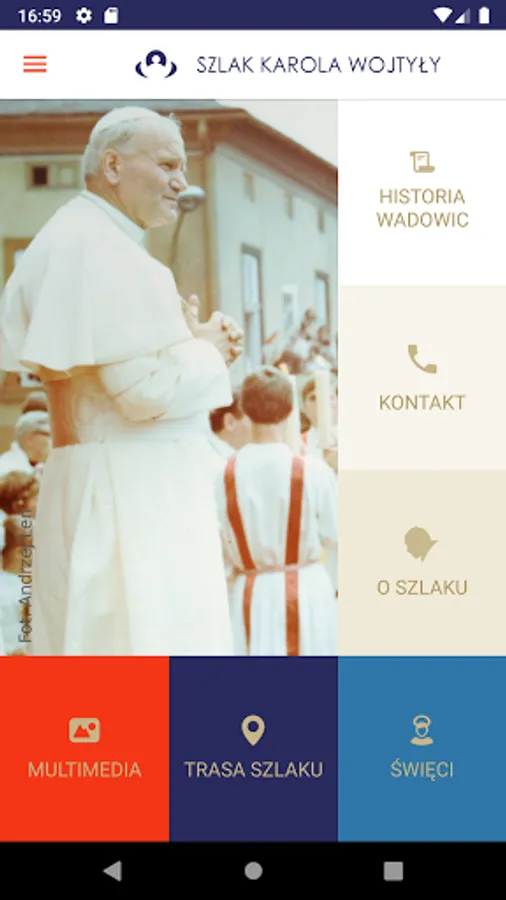 The application includes information such as the history of Wadowice, list of saints and famous people associated with Wadowice, as well as photo and video galleries of John Paul II.