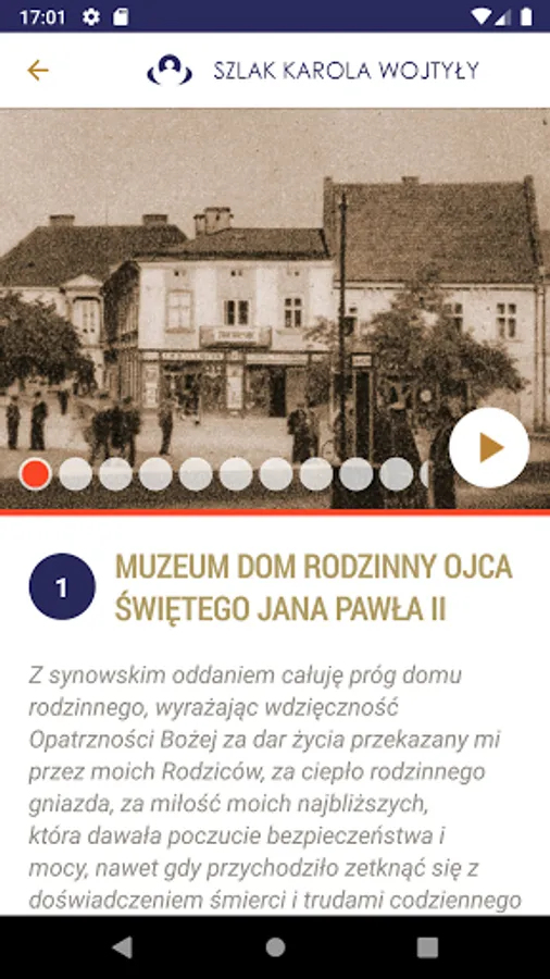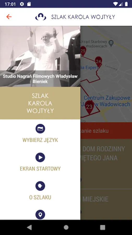 The "Trail of Karol Wojtyła" mobile application is an audio-guide of the Wadowice trail connecting 13 sites associated with the youth of Karol Wojtyła.