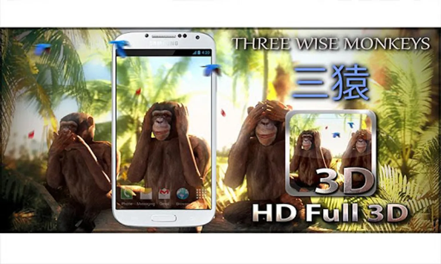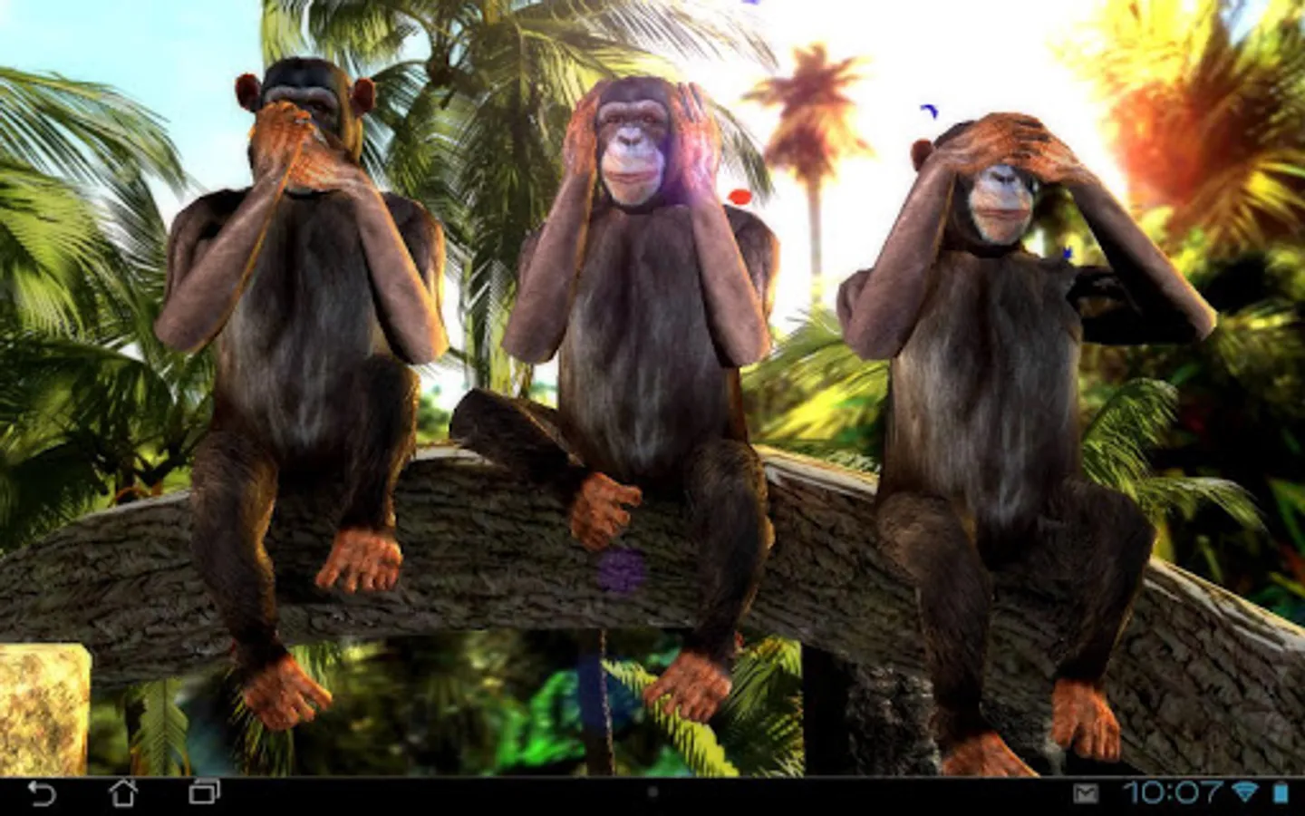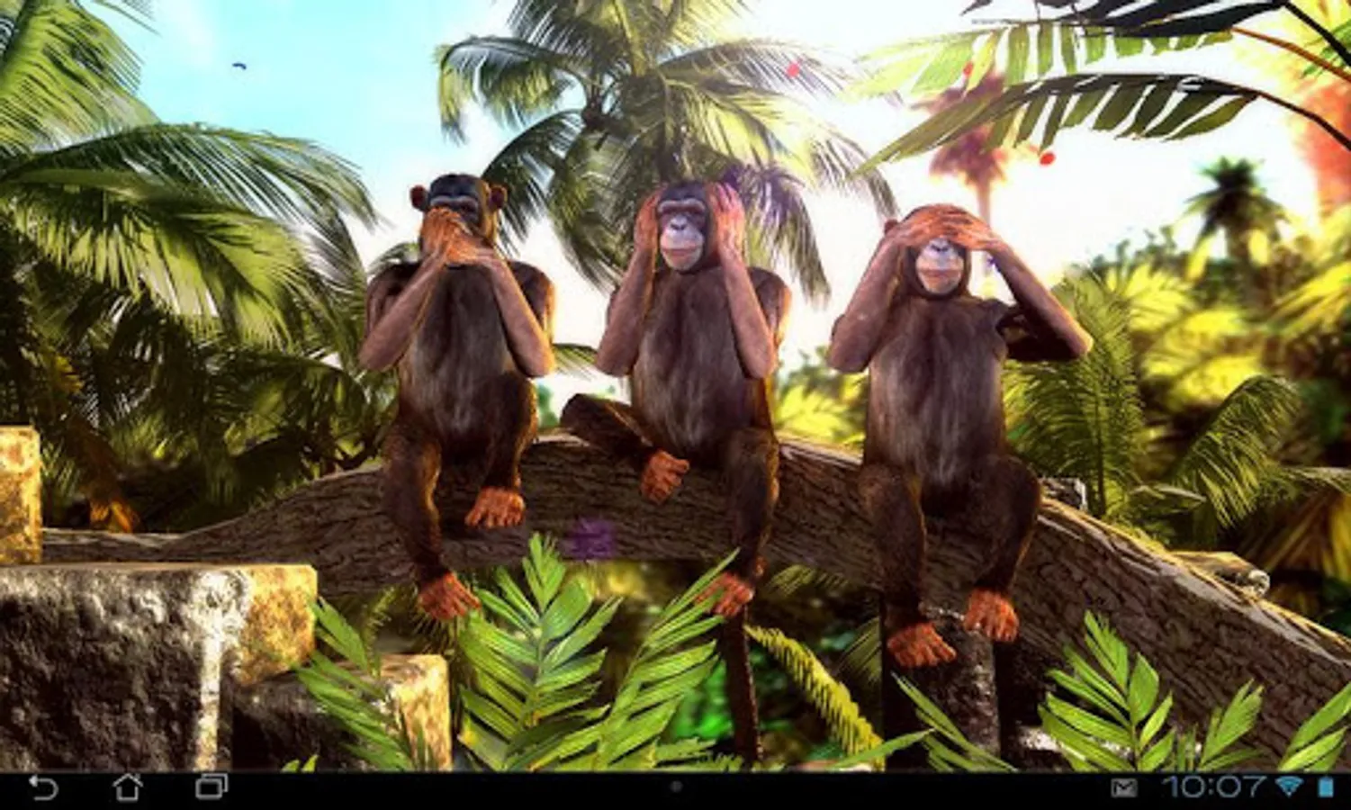 New and one of the best 3D live wallpapers on Google Play for your phone or tablet! Fully animated three wise monkeys change their positions while screens swipe! Funny and realistic apes will for sure make your day and add a bit of ancient Japan philosophy to your mind. Fantastic 3d scenery of jungle with plenty of plants, blue birds and falling colorful leaves are making environment absolutely believable. Now with many cameras and totally reworked visual!