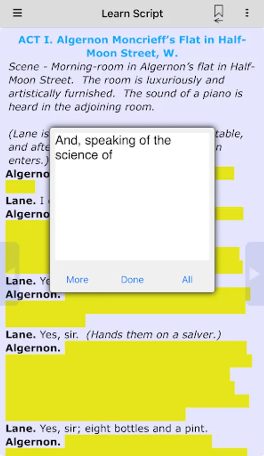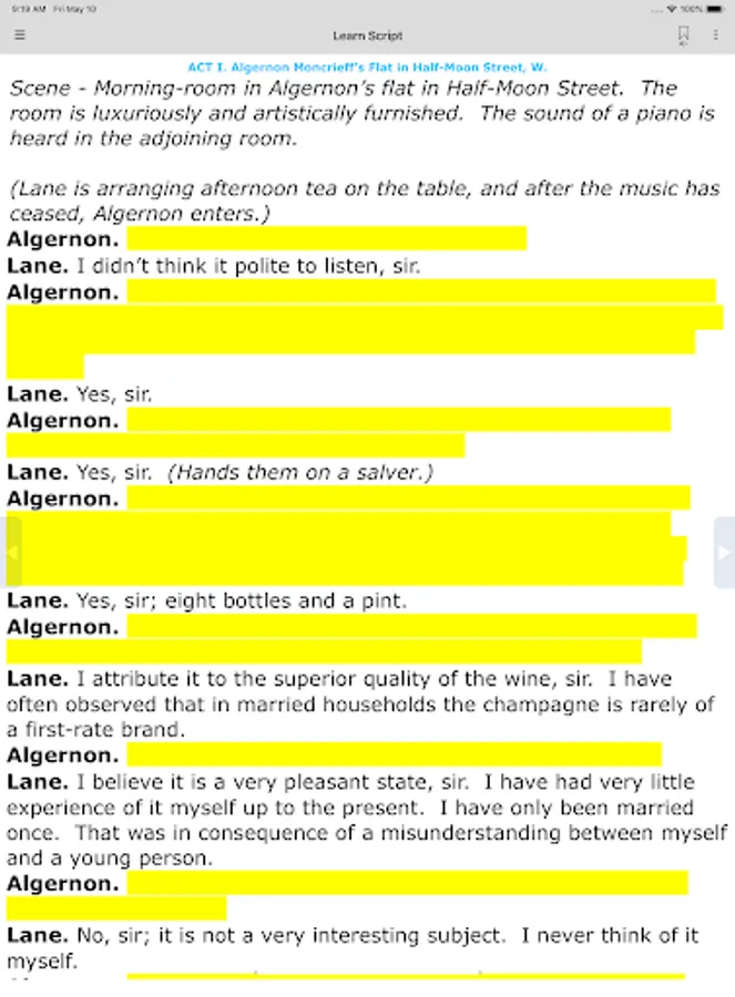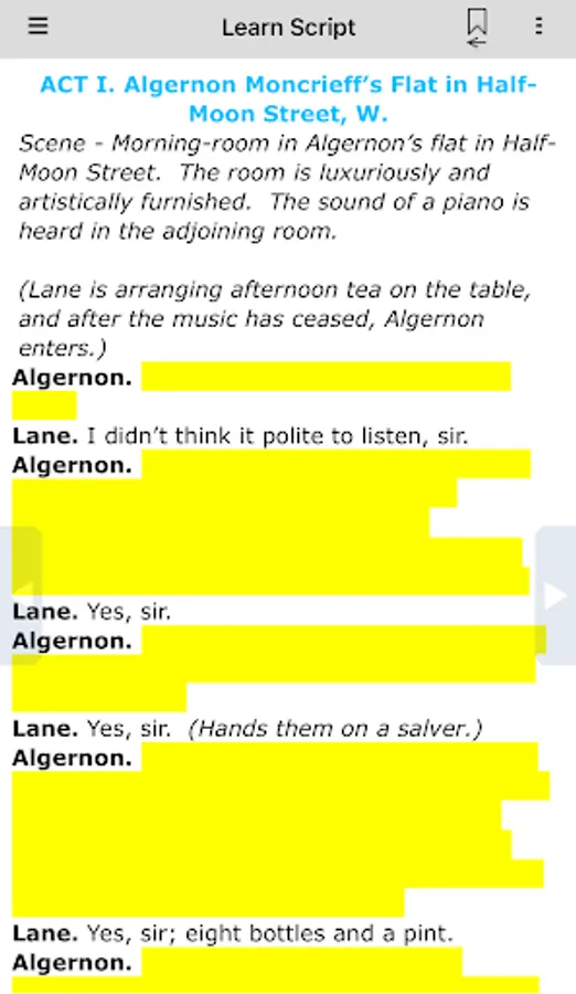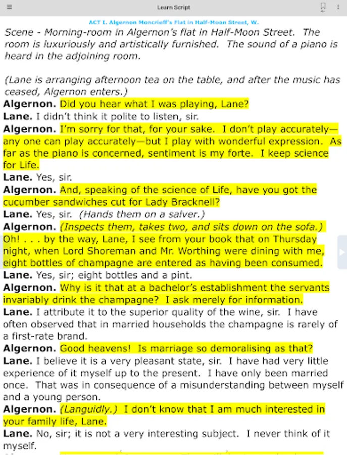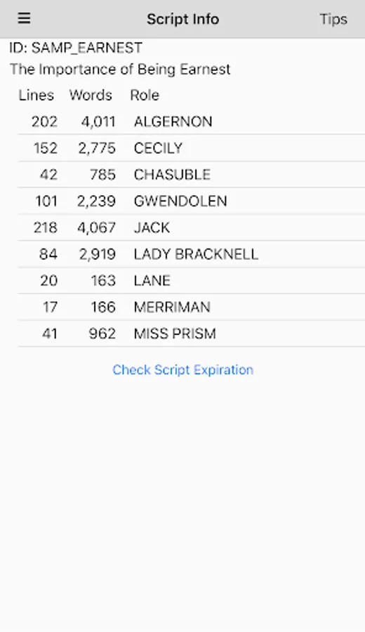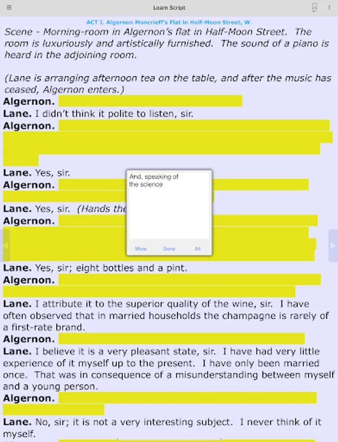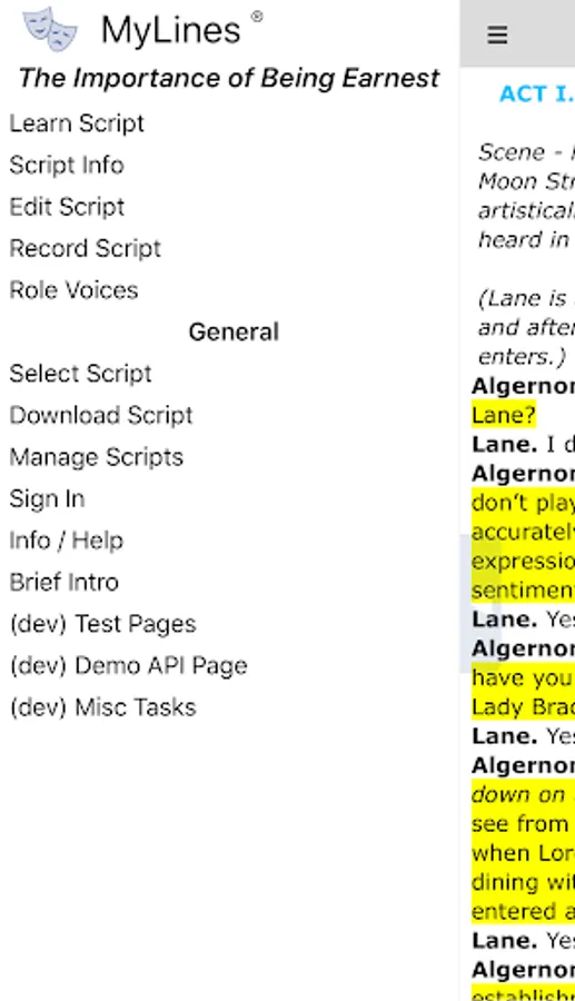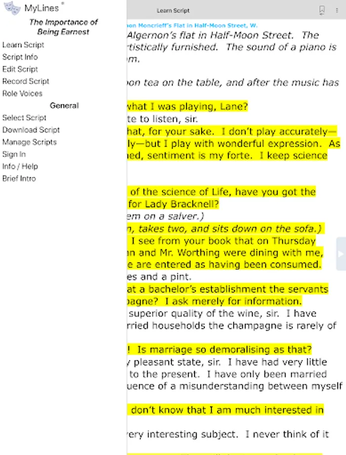 My Lines is a tool that assists actors in memorizing their lines. It presents the script in a way that shows the actor's role separate from those of the other roles. It helps to minimize the need to have a second person help with the lines.