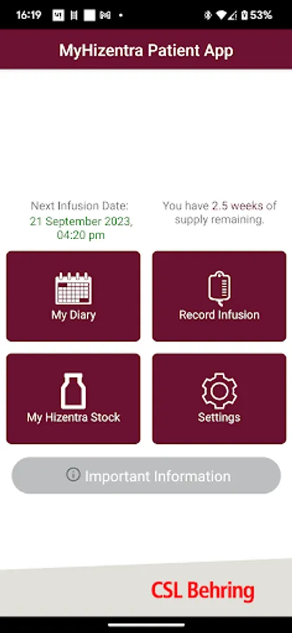 The MyHizentra™ App has been developed on behalf of CSL Behring (Australia) Pty Ltd ABN 48 160 734 761 (“CSL Behring”), 189–209 Camp Rd, Broadmeadows VIC 3047, Australia.