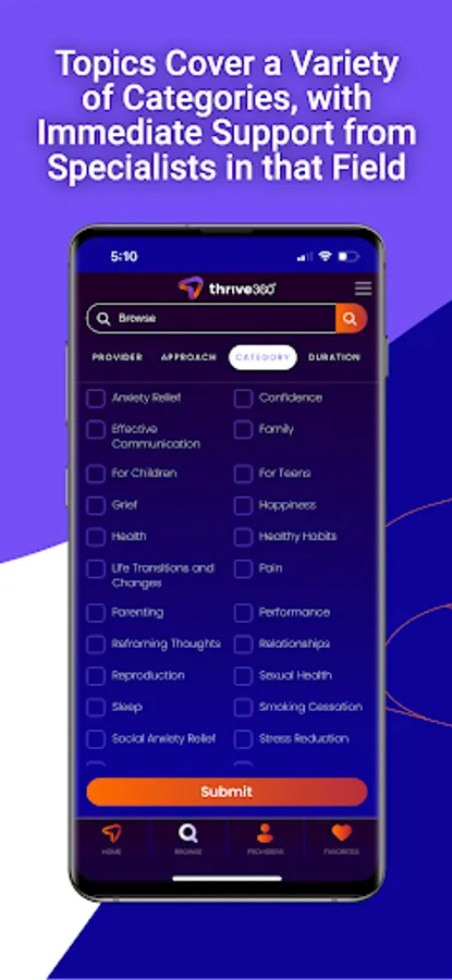 With Thrive360, you have a professional guide in your pocket, available to you anytime, anywhere. No more waiting for appointments or speaking with strangers. You can now receive personalized support and guidance within the comfort and privacy of your own space. Thrive360 recreates and enhances the in-office experience with specialists in different areas, so you can get trusted support immediately.