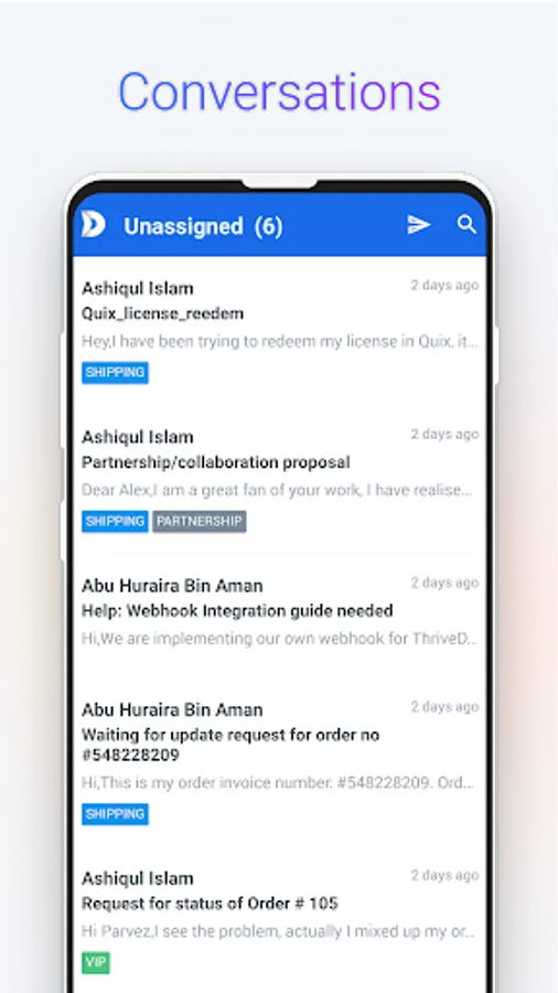 With ThriveDesk’s helpdesk mobile app your whole team can collaborate to answer queries in its Shared Inboxes, close sales deals with access to all previous conversations and purchase history and provide customer support on the fly with Live Chat.