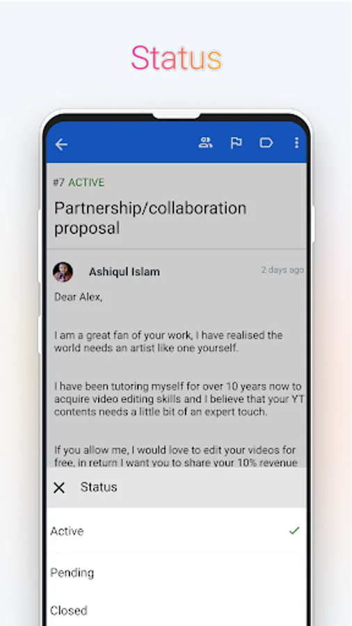 Shared Inbox - receive all your support and sales queries on the respective shared inbox, where all you agents can have access and view the queries. You can assign tasks to an agent for reply or you can reply yourself.
