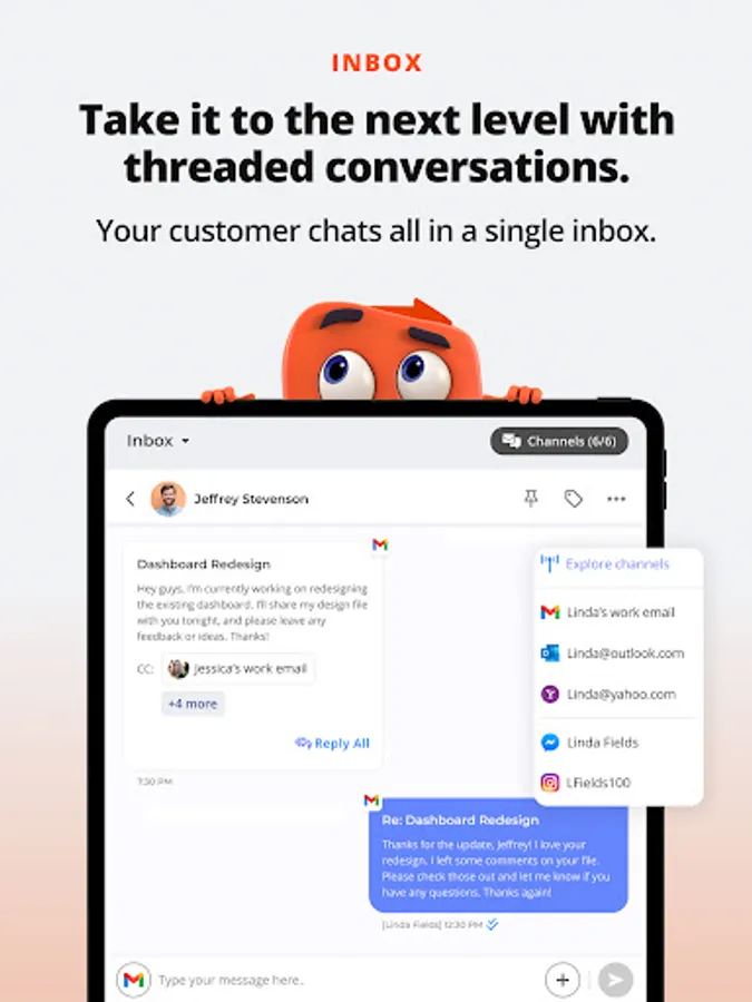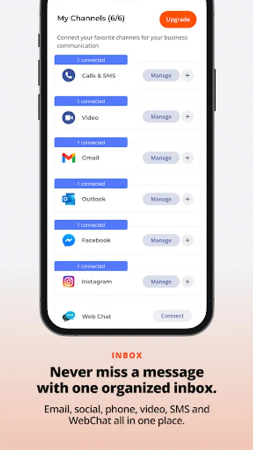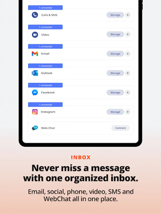 · Inbox: access all your favorite channels within one single conversation for every customer. With Inbox, all your client messages from email, social media, phone, video, SMS, and even WebChat are unified into one easy to follow thread so you can get back to running your business.