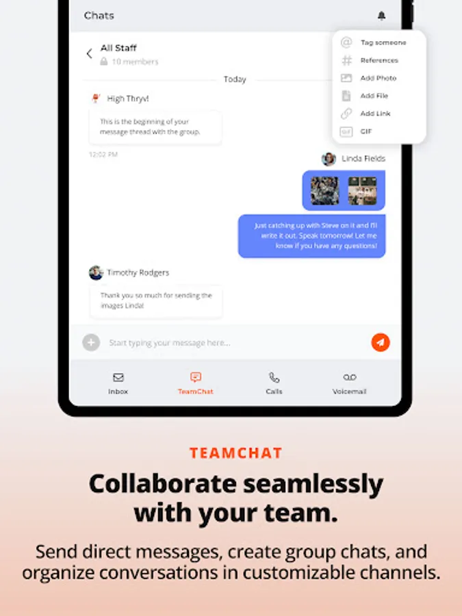 · TeamChat: direct and group message your team members or set up channels for conversations on specific projects and clients. Plus, stay organized with activity tags, staff mentions, status updates, and markups for images so you can discuss projects more visually with your teams and get work done faster.