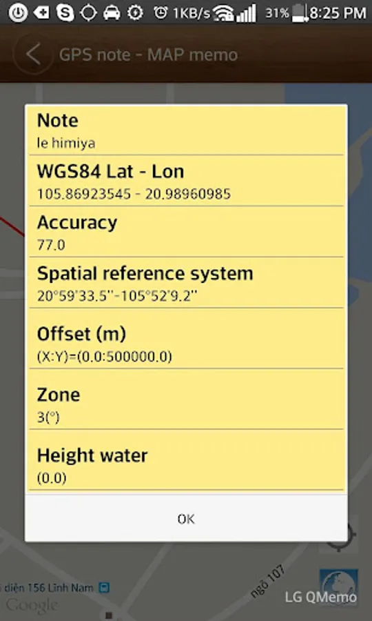 Saved location is displayed on a map. Details screen will display, saved time, GPS error, spatial reference system, latitude, longitude, azimuth, altitude. Location can be overwritten many times.