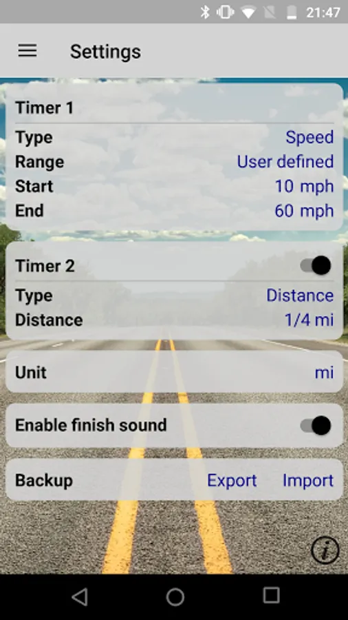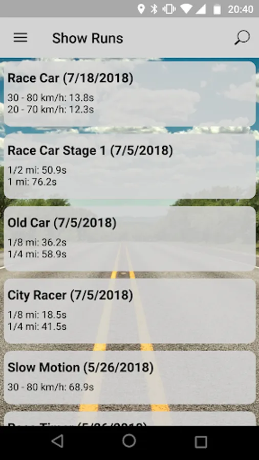 The app supports drag races such as 1/4 mile races or speed-based races such as 100 - 200 km/h and can measure up to two times per race.