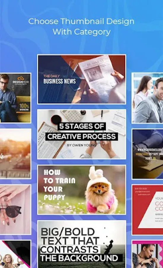 With video thumbnails maker, there's no need to hire a professional thumbnail or graphics banner designer. After all, time and money are a treasure in business. Go ahead and download the video thumbnails & banner maker app for free to start creating stunning thumbnails & cover photos for social media post.