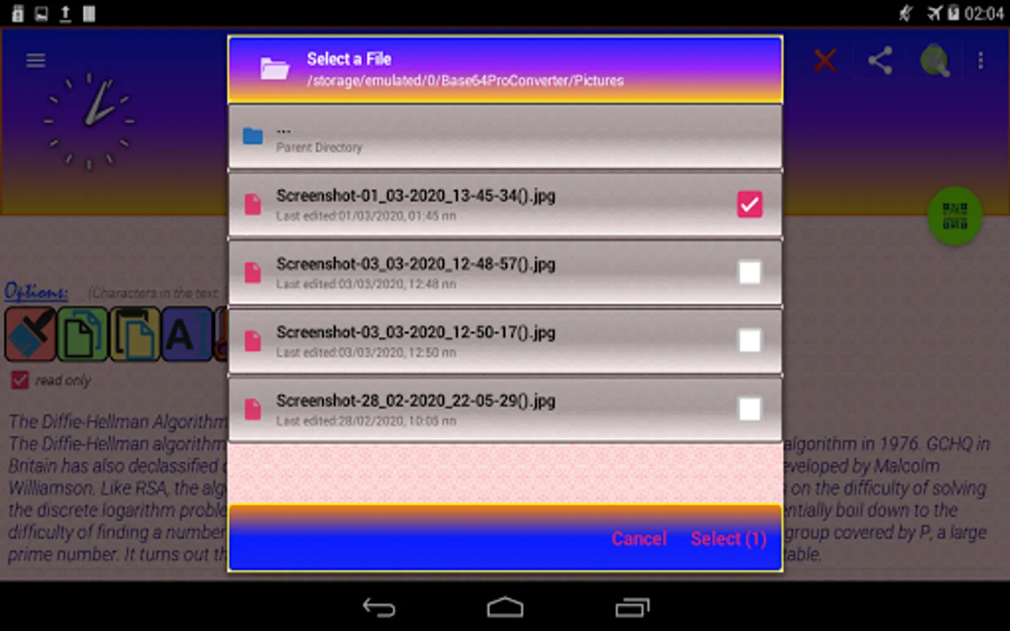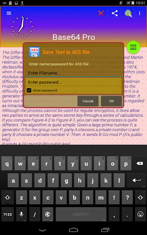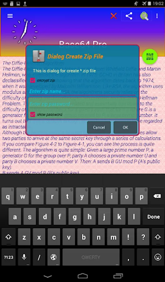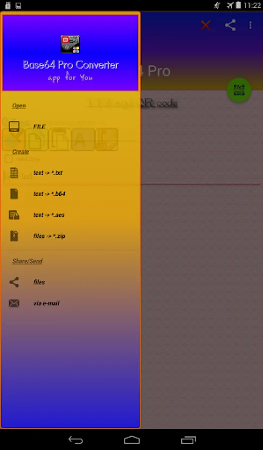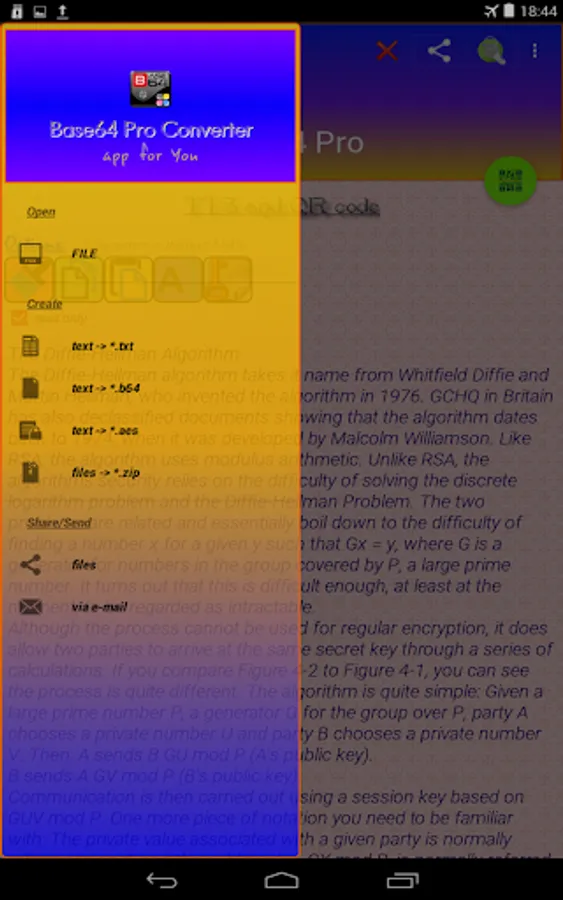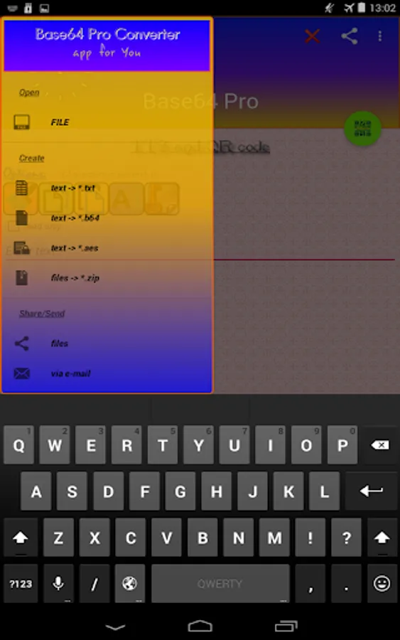 Base64 Pro also works with txt, b64 (Base64), aes*, zip (usual and encrypted) and zip.aes multi crypted files.