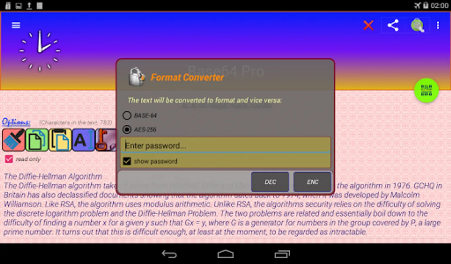 You can change the text according to your taste. The text is formatted: cleaned, copied, pasted, converted to Base64 and encrypted using the well-known AES-256 encryption algorithm.