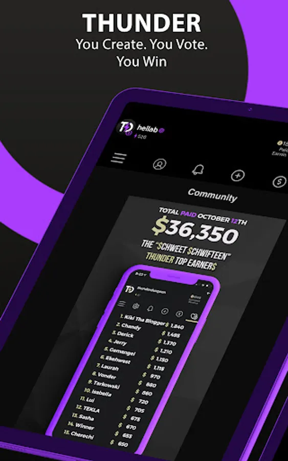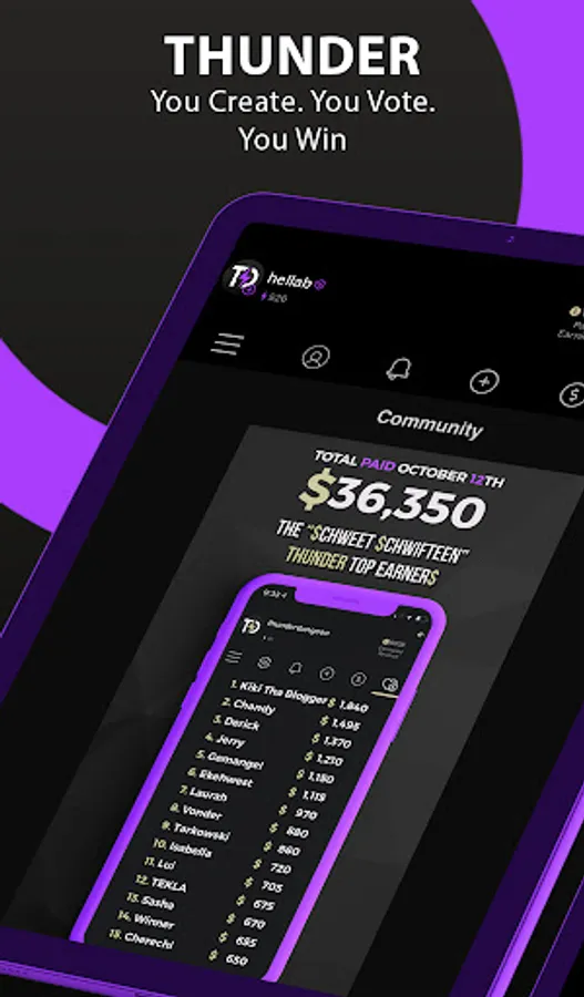 The Thunder tab displays and ranks all of the top posts from the previous 24 hours. Those that make it to the top of Thunder will be awarded cold hard cash. A portion of all of the ad revenue on this cool fun app goes into the pool, and then directly into your pocket. That means the more users we get, the more (and bigger) payouts we can award.