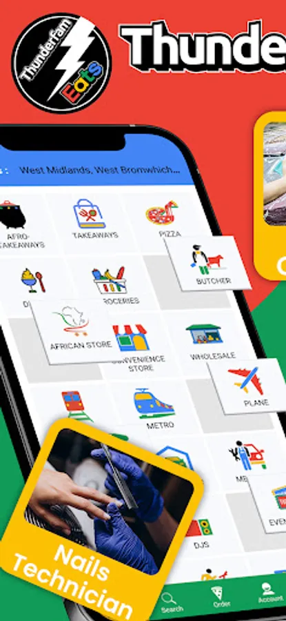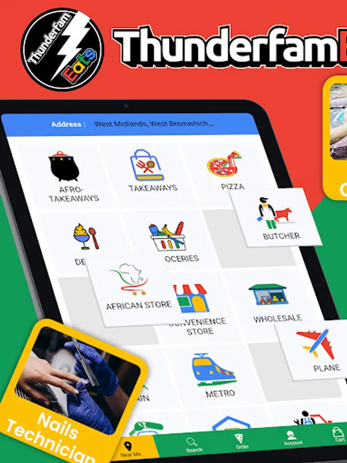 ThunderfamEats is a Platform allowing users to buy food, good, services from Wholesale, Grocery stores, Restaurants, Takeaway, Handyman, Electrician, Builders, Cleaning company, Taxi, Transport company, Mechanic, Car rental, Car dealers, Hand Car wash, Computer repair, Driving School, Tailor Man, Arts, Web & App Development, Barber, Hairdresser, Hotel, Clubs, DJs, Event Tickets seller, Training course centre, Gyms, Nursery, pharmacy and private seller.